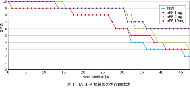 Meth-A接種後のマウスは、nEF10mg/Kg B.W/day投与群(図1紫色グラフ)で生存率が向上しました。