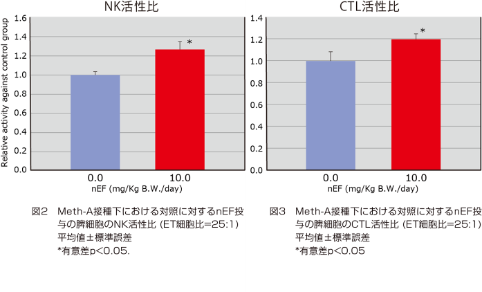 図2および図3より、Meth-A接種下においても、nEF投与によりNK(ナチュラルキラー細胞)とCTL(細胞傷害性Tリンパ球)の活性化を確認しました。