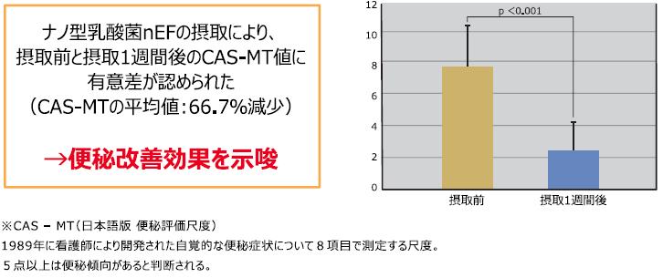 便秘気味の日本人女性15名(平均年齢44.7歳±6.1歳)を対象に、ナノ型乳酸菌nEFを1兆個/日、1週間摂取してもらい、摂取前後の排泄状況をCAS-MT※にて評価したところ、摂取前と摂取1週間後の間に有意差が確認できました。