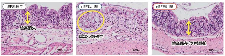 DSS腸炎発症マウスにナノ型乳酸菌nEFをあらかじめ投与しておくことで、DSS腸炎発症を予防できることが確認できました。