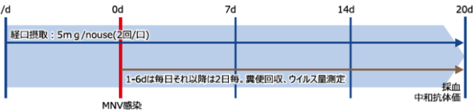 | 試験方法 3群(コントロール(蒸留水投与)群、非ナノ化乳酸菌投与群、ナノ型乳酸菌投与群)に分けたマウスを感染7日前から感染後21日後まで毎日強制経口投与する。ノロウイルスに感染させた後に、プラークアッセイにて糞便中ウイルス量と感染後3週間目の血清中中和抗体価の測定を行った。 |