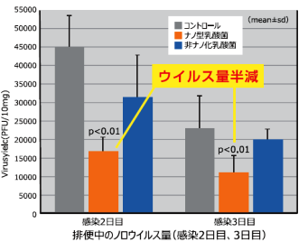 ナノ型乳酸菌投与群は非ナノ乳酸菌投与群よりも、感染後二日目、三日目といった早い時期での糞便中ウイルスの増殖を顕著に抑制することが確認できました。