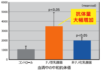 ウイルスを消失させるはたらきを数値化した中和抗体価においても、ナノ型乳酸菌投与群はより高い値を示しました。