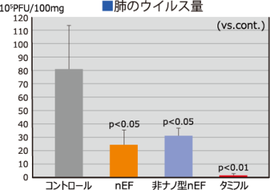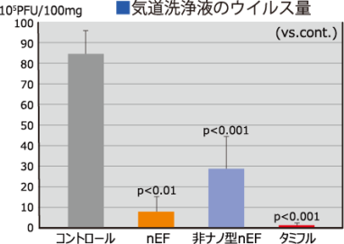 感染3日後の肺及び気道のウイルス量は、nEF群でコントロール群、非ナノ型nEF群と比較し、インフルエンザウイルスを顕著に抑えることを確認しました。