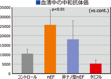 薬剤のタミフルはウイル量を顕著に抑えることができますが、中和抗体価を上げることはできません。ナノ型乳酸菌nEF®を摂取することで、中和抗体価を上げることができるため、感染のリスクも低減することが期待できます。