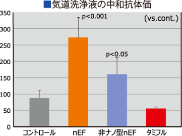 感染14日後の血清中及び気道中の中和抗体価は、nEF群でコントロール群、非ナノ型nEF群、タミフル群よりも高値を示しました。