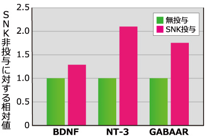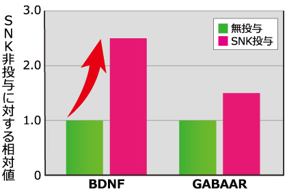ストレス状態ではBDNFが減少しますが、SNKを投与したストレス負荷マウスの脳海馬の脳神経栄養因子BDNFのmRNA発現量は、無投与マウスに対し2.5倍高くなりました。さらに、GABA A受容体のmRNA発現レベルも高くなる傾向が見られました。