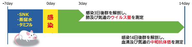 マウスを3群(コントロール群:蒸留水投与、SNK群:ナノ型乳酸菌SNK投与、タミフル群:タミフル投与)に分け、インフルエンザウイルスを感染させる7日前から経口投与しました。