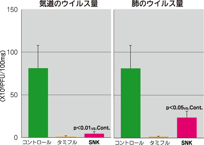 感染3日後のウイルス量は、SNK群でコントロール群と比較し、インフルエンザウイルスを顕著に抑えることを確認しました。