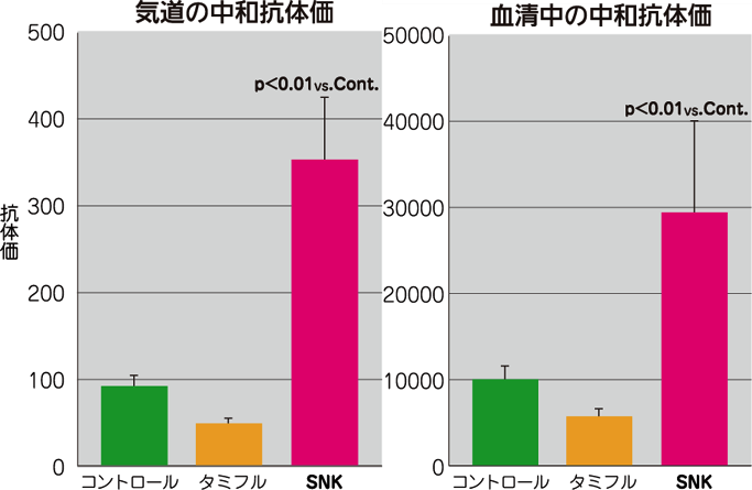 感染14日後の中和抗体価は、SNK群でコントロール群、タミフル群よりも、高値を示しました。