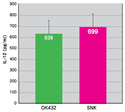 サイトカインの一種であり、Th1細胞への分化を誘導するとされるIL-12の産生誘導能について植物性ナノ型乳酸菌SNKとOK432(免疫療法剤)を比較したところ、同程度の活性を示しました。