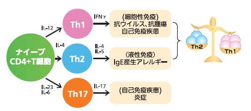 胸腺で生まれたヘルパーT細胞はナイーブT細胞として胸腺外に放出され、さらに外来抗原により活性化したCD4+T細胞が、Th1(細胞性免疫)、Th2(液性免疫)、Th17(自己免疫疾患の病態形成に関与)の役割を持つ細胞に分化し、免疫応答を誘導します。