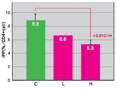 マウス30匹を10匹ずつの3群(C:無投与、L:SNK2mg/kg/日、H:SNK10mg/kg/日)に分けて15日間経口投与する。10日目から腸炎を誘発するデキストラン硫酸ナトリウムを投与し炎症状態にする。16日目に解剖し、各群のTh17細胞割合の解析及び転写因子の遺伝子発現を実施した。