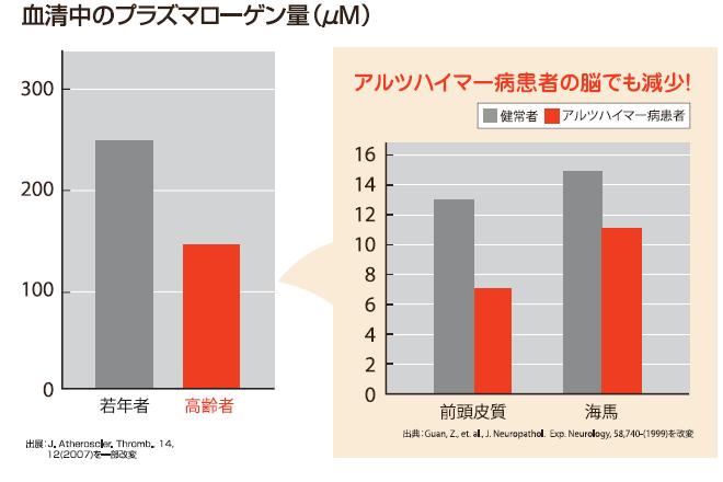 加齢に伴い、血液中のプラズマローゲン量は4割ほど減少していくと考えられています。さらに、アルツハイマー型認知症患者の脳内でプラズマローゲン量が低下することが確認されました。