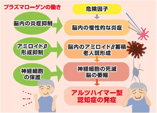 プラズマローゲンは、認知症の発症にかかわるとされる脳内の炎症や、アミロイドβたんぱく質の蓄積を抑える、さらに、情報を伝えるはたらきのある神経細胞に栄養を与えることで神経細胞を守り、生存率を高めることがマウスや細胞試験にて確認されています。